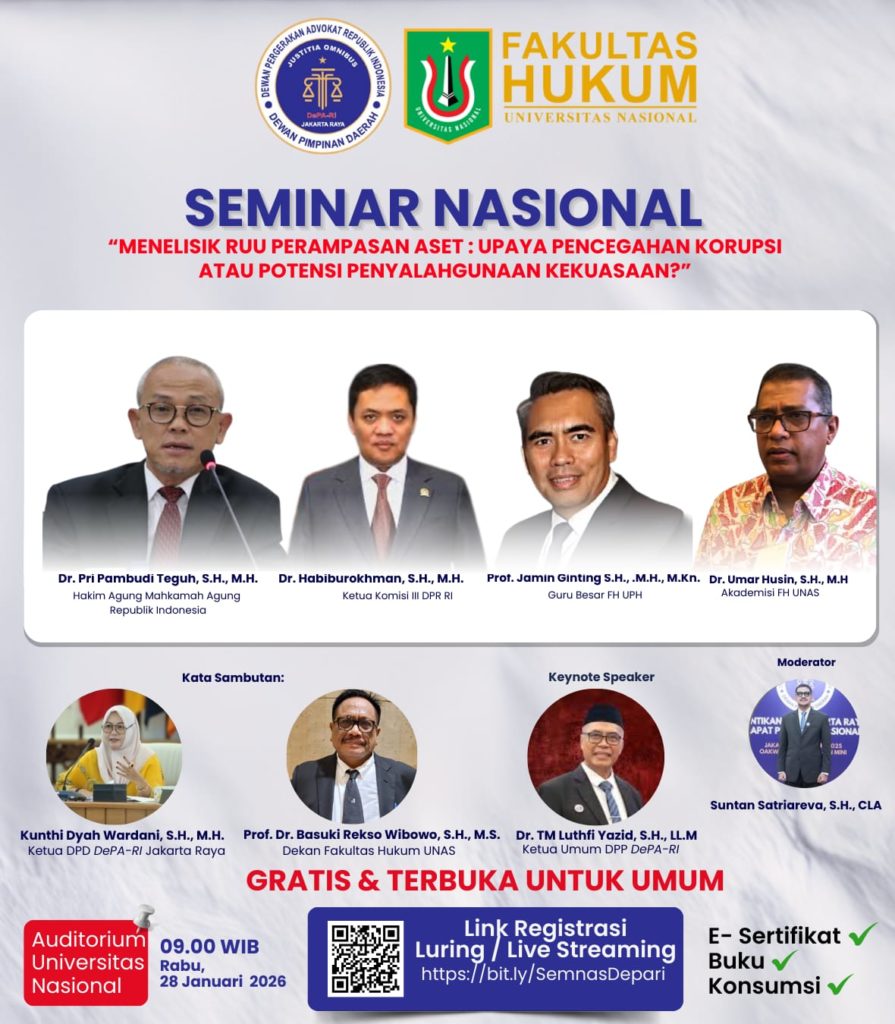 Seminar Nasional (DePA-RI) Jakarta Raya bersama Fakultas Hukum Universitas Nasional “Menelisik RUU Perampasan Aset: Upaya Pencegahan Korupsi atau Potensi Penyalahgunaan Kekuasaan?”